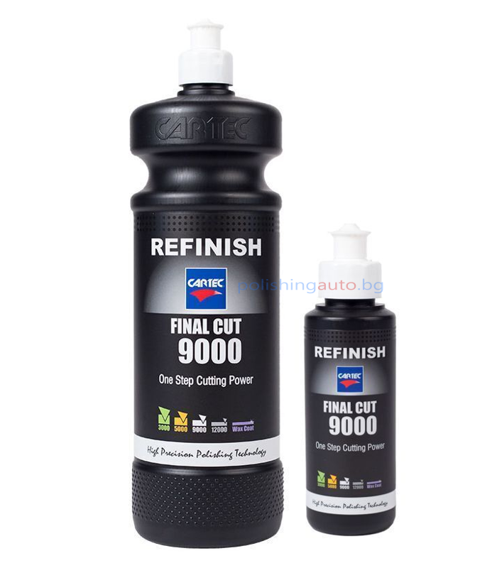 Cartec Final Cut 9000 е професионална полираща паста със средно-мека абразивност, разработена за финално коригиране и придаване на огледален блясък на автомобилните повърхности. Подходяща е за употреба както с ротационни, така и с орбитални (DA) машини.