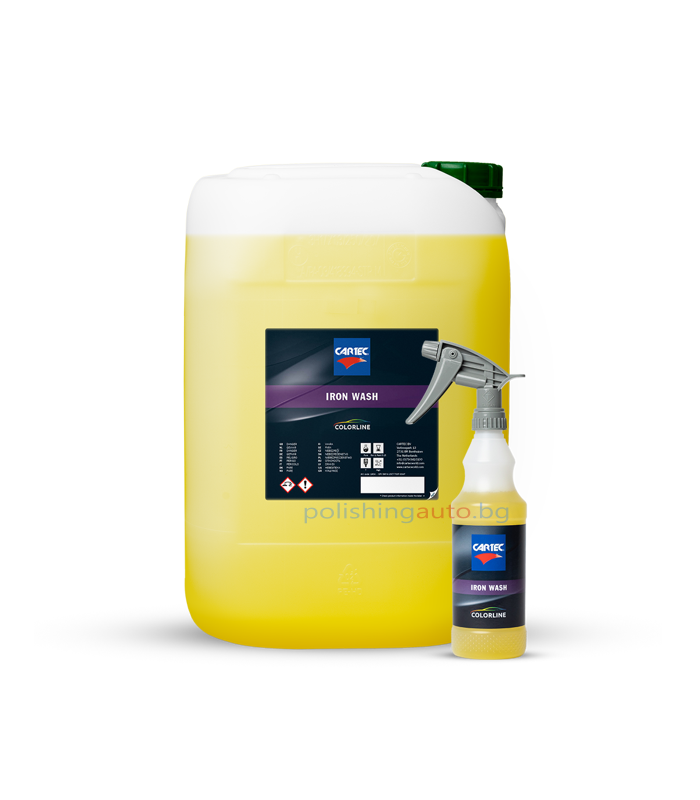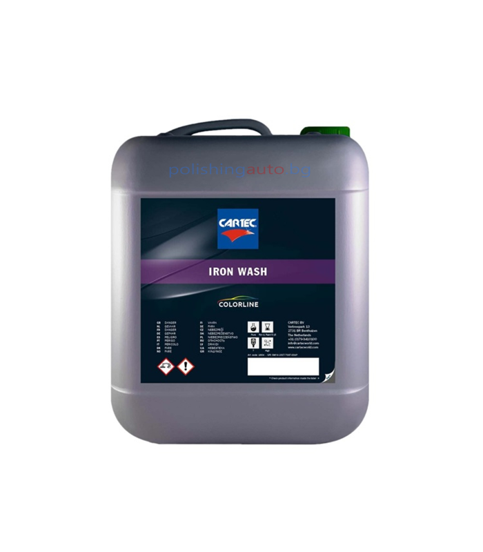 Cartec Iron Wash е pH неутрален почистващ препарат, който визуално реагира с железни частици (окислявания, прах от спирачки), като ги оцветява в лилаво и улеснява безопасното им отстраняване от боята и джантите.