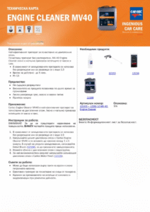 Cartec MV-40 Engine Cleaner е вискозен и ефективен препарат, предназначен за почистване под капака — на двигателя и околните части. Без съдържание на силни разтворители (solvent-free), той прониква дълбоко и разтваря мазнини, масла и упорити отлагания като underseal и битум.