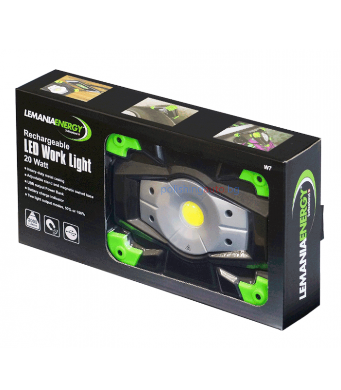 Компактен и мощен LED прожектор Lemania W7 с регулируема яркост, презареждаща се батерия и практични функции, идеален за работа в гараж, сервиз, детайлинг или при слабо осветени пространства.