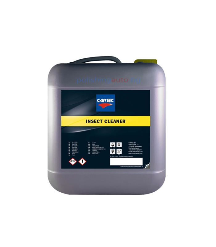 Cartec Insect Cleaner е концентриран, нежно-агресивен почистващ препарат, който ефективно разтваря и премахва насекоми и техните следи от боя, хром, алуминий и стъкло, без да уврежда повърхностите.