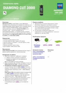 Diamond Cut 3000 е подходяща както за нови, така и за стари бои и лакове. Работи отлично с ротационни и орбитални (DA) машини, в комбинация със зелените полиращи гъби на Cartec. Продуктът е без силикони и пълнители, което гарантира реално отстраняване на дефектите, а не временното им прикриване.